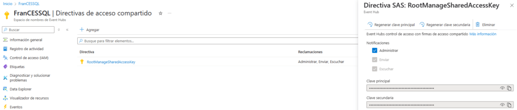 • Generate our Event Hub in Azure Event Hubs and create the SAS key. (We won’t detail the entire process here, as it’s not the main focus of this post.)