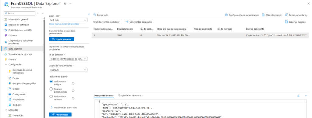 • We verify that the data has been replicated to our Azure Event Hub correctly.